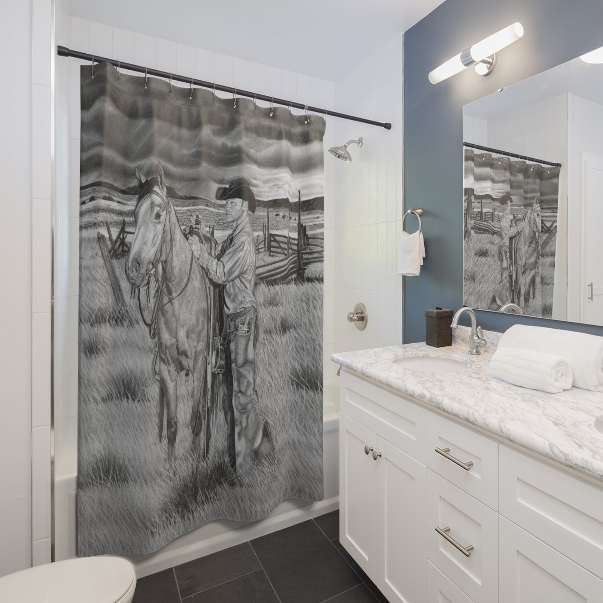Bring a quiet, weathered ranch moment into your bathroom with this evocative shower curtain. Rendered in charcoal tones, the scene shows a cowboy beside his saddled horse under sweeping skies—a slow, reflective pause after a long day on the range. The muted palette and detailed shading create a mood of calm endurance, making every quick morning rinse or late-night soak feel like a small step back into wide-open country. It pairs naturally with rustic wood accents, cast-iron fixtures, and earth-toned linens, and holds up to daily use while keeping the artwork as the room’s focal point.