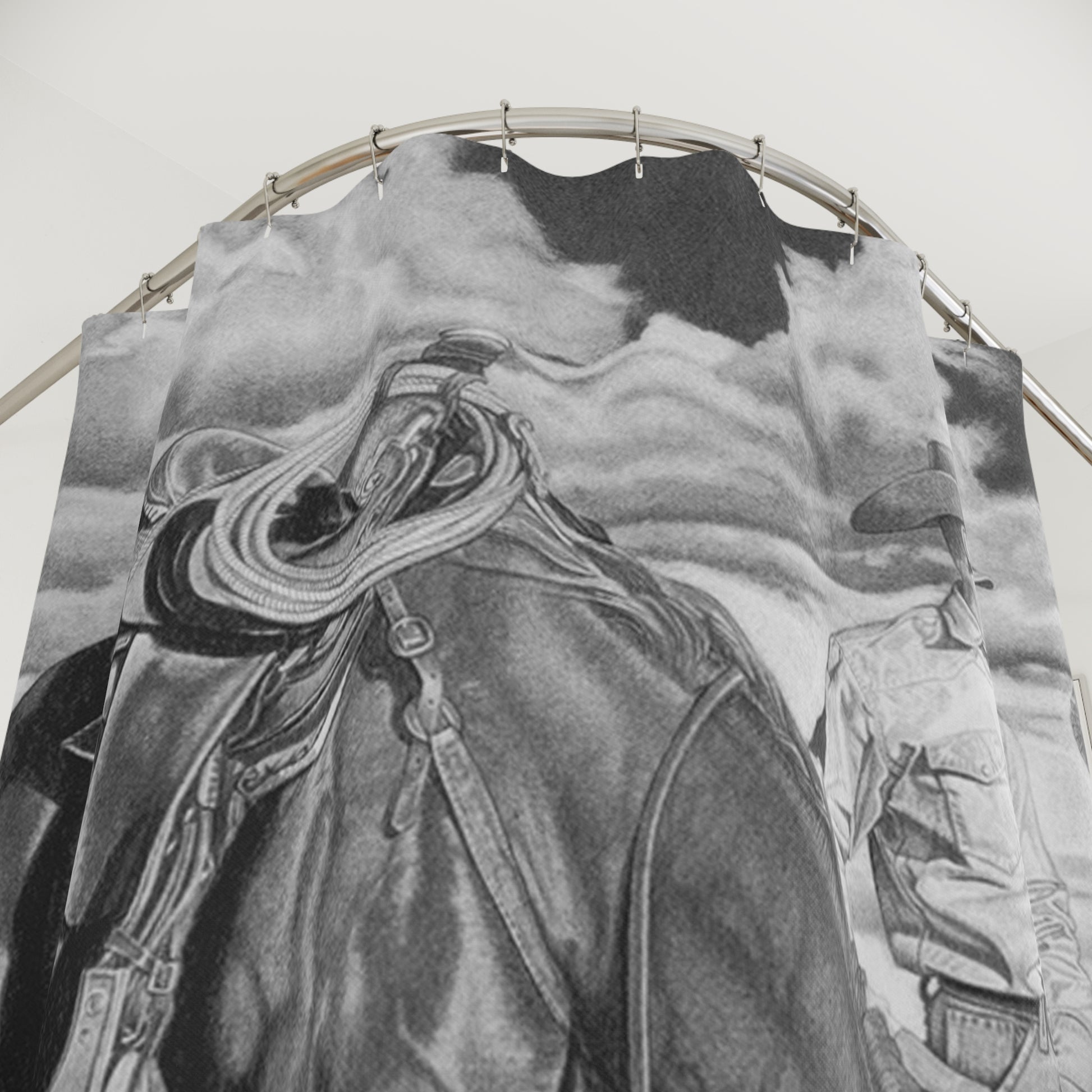 Bring a quiet, weathered ranch moment into your bathroom with this evocative shower curtain. Rendered in charcoal tones, the scene shows a cowboy beside his saddled horse under sweeping skies—a slow, reflective pause after a long day on the range. The muted palette and detailed shading create a mood of calm endurance, making every quick morning rinse or late-night soak feel like a small step back into wide-open country. It pairs naturally with rustic wood accents, cast-iron fixtures, and earth-toned linens, and holds up to daily use while keeping the artwork as the room’s focal point.